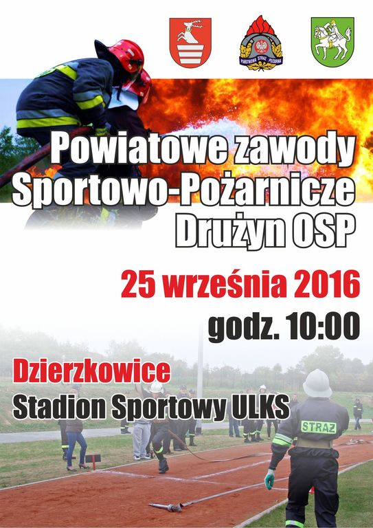 25 września 2016 roku o godzinie 10.00 na Stadionie Sportowym ULKS w Dzierzkowicach odbędą się Powiatowe zawody Sportowo-Pożarnicze Drużyn OSP.