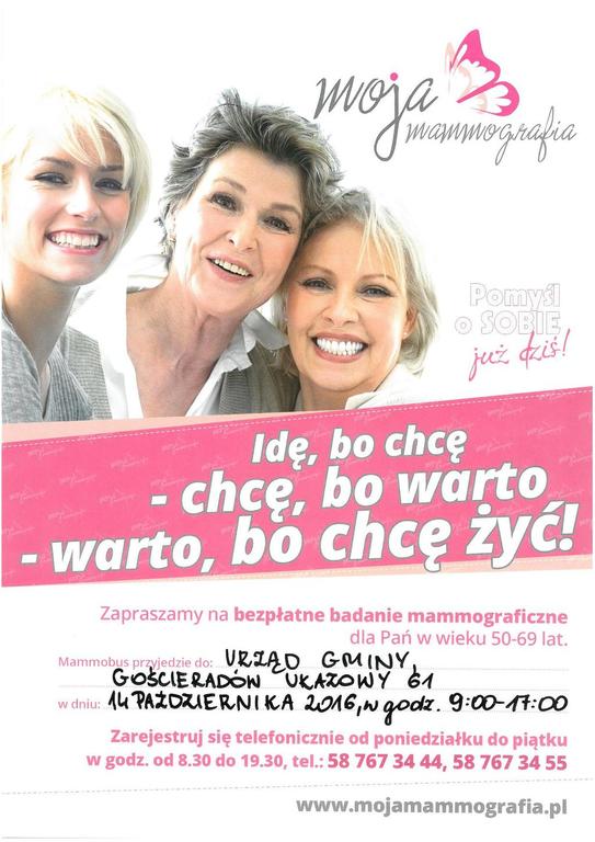 14 października 2016 r. zapraszamy wszystkie Panie w wieku 50-69 lat na bezpłatne badanie mammograficzne.