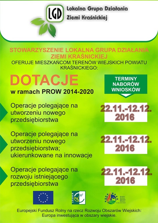 Lokalna Grupa Działania Ziemi Kraśnickiej ogłasza nabory wniosków na operacje związane z podejmowaniem lub rozwijaniem działalności gospodarczej w ramach PROW 2014-2020. Nabory prowadzone będą od 22 listopada 2016 r. do 12 grudnia 2016 r. Szczegóły naborów znajdują się na stronie internetowej LGD: http://www.lgdkrasnik.pl/portal/Nabor_wnioskow_w_ramach_PROW_2014_2020_1/