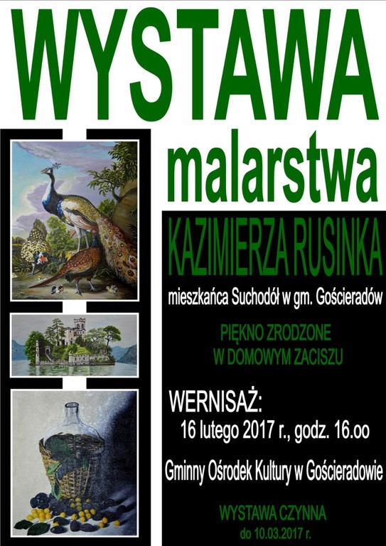 Gminny Ośrodek Kultury w Gościeradowie zaprasza na wystawę malarstwa Kazimierza Rusinka. Wystawa czynna do 10.03.2017 r.