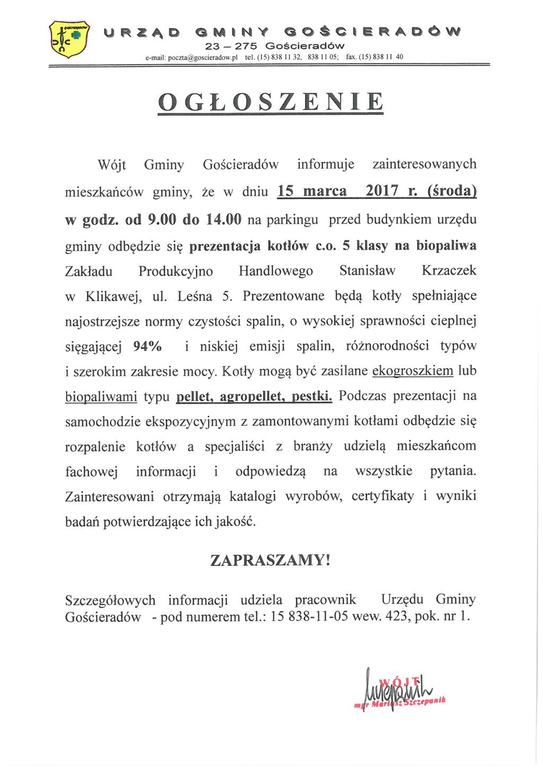 w godz. od 9.00 do 14.00 na parkingu przed budynkiem urzędu gminy odbędzie się prezentacja kotłów c.o. 5 klasy na biopaliwa Zakładu Produkcyjno Handlowego Stanisław Krzaczek