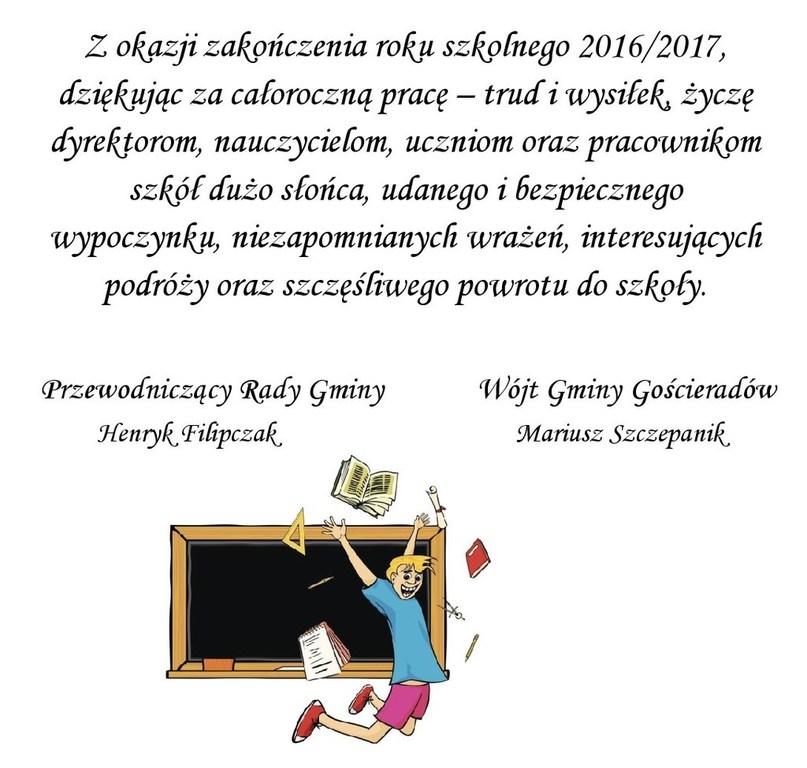 Z okazji zakończenia roku szkolnego 2016/2017, dziękując za całoroczną pracę – trud i wysiłek, życzę dyrektorom, nauczycielom, uczniom oraz pracownikom szkół dużo słońca, udanego i bezpiecznego wypoczynku, niezapomnianych wrażeń, interesujących podróży oraz szczęśliwego powrotu do szkoły.