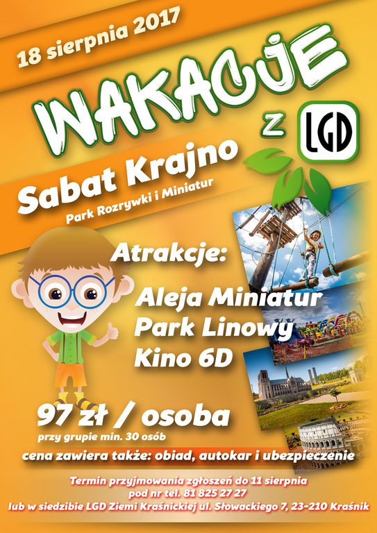 Lokalna Grupa Działania Ziemi Kraśnickiej w dniu 18 sierpnia br. organizuje wyjazd do Sabat Krajno Park Rozrywki i Miniatur. Zachęcamy do udziału w wycieczce całe rodziny. Ilość miejsc ograniczona.