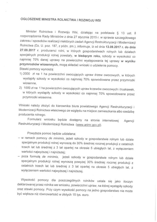 Ogłoszenie Ministra Rolnictwa i Rozwoju Wsi