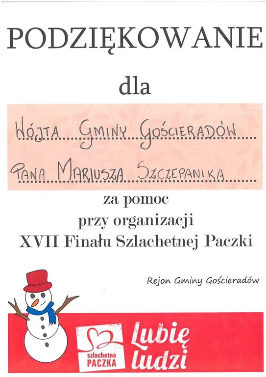 W niedzielę 10 grudnia 2017r. zakończył się XVII Finał Szlachetnej Paczki. Do tegorocznej akcji włączyła się Młodzieżowa Rada Gminy Gościeradów. Radni wraz z nauczycielami oraz dyrekcją szkół przeprowadzili zbiórkę żywności dla psów z Przytuliska w Rachowie Starym. W akcji wzięły udział: