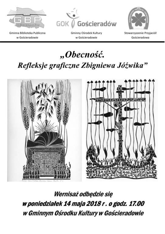 Gminna Biblioteka Publiczna w Gościeradowie, Gminny Ośrodek Kultury w Gościeradowie oraz Stowarzyszenie Przyjaciół Gościeradowa mają zaszczyt zaprosić na werniszaż „Obecność. Refleksje graficzne Zbigniewa Jóźwika” który odbędzie się w poniedziałek 14 maja 2018 r . o godz. 17.00 w Gminnym Ośrodku Kultury w Gościeradowie.