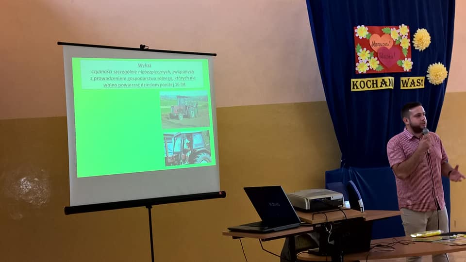 W dniu 11 czerwca br. z inicjatywy wójta Mariusza Szczepanika, w Zespole Placówek Oświatowych w Gościeradowie odbyło się spotkanie z przedstawicielem placówki terenowej KRUS w Kraśniku. Pan Piotr Dorot, przeprowadził z uczniami pogadankę na temat zagrożeń, jakie mogą napotkać dzieci podczas pracy w gospodarstwie rolnym. Uczniowie obejrzeli też przygotowany dla nich film edukacyjny, przedstawiający różne niebezpieczne sytuacje dla dzieci mieszkających na wsi.