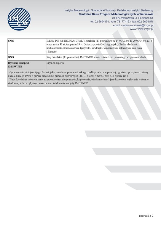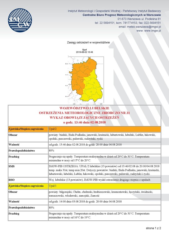 Informujemy, że od godz. 13:46 dnia 02.08.2018 do godz. 20:00 dnia 04.08.2018 prognozuje się upały. Temperatura maksymalna w dzień od 29°C do 31°C. Temperatura minimalna w nocy od 17°C do 20°C.