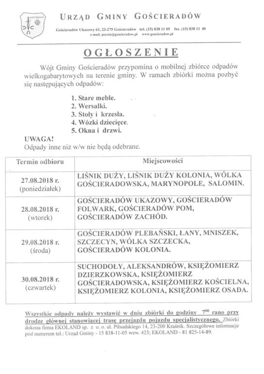 Na terenie gminy w poszczególne dni będą zbierane odpady wielkogabarytowe. Wszystkie odpady należy wystawić w dniu zbiórki do godz. 7.00 przy drodze głównej stanowiącej trase przejazdu pojazdu specjalistycznego.