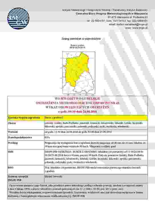 Prognozuje się od godz. 13:30 dnia 24.08.2018 do godz. 3:00 dnia 25.08.2018 wystąpienie burz z opadami deszczu miejscami od 20 mm do 30 mm, lokalnie do 40 mm oraz porywami wiatru do 90 km/h. Miejscami możliwy grad.