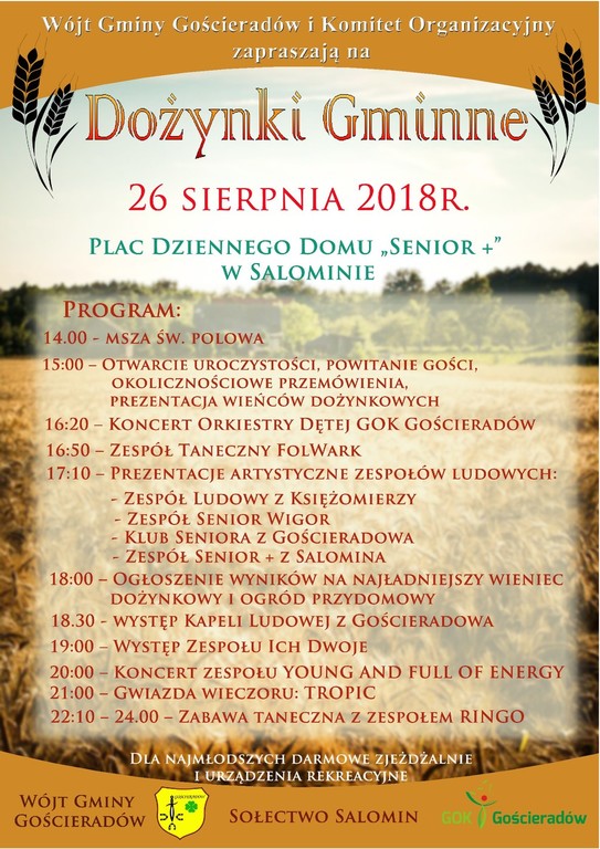 Serdecznie zapraszamy 26 sierpnia 2018r. (niedziela) od godz. 14.00 na plac przy Dziennym Domu "Senior +" w salominie.