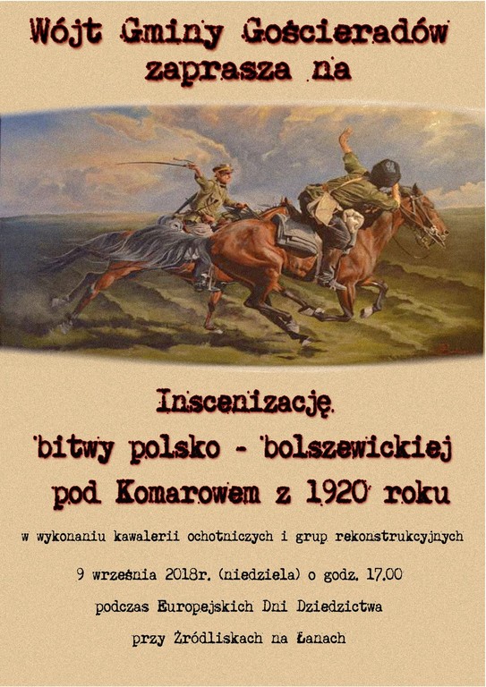 Zapraszamy 9 września br. (niedziela) od godz. 14.00 na Źródliska w Łanach. W trakcie festynu odbędzie się inscenizacja bitwy polsko - bolszewickiej pod Komarowem z 1920 roku.