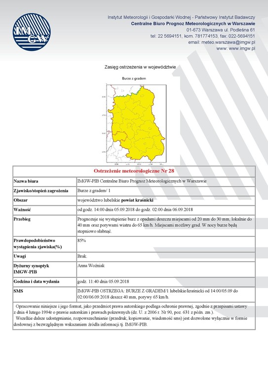 Od godz. 14:00 dnia 05.09.2018 do godz. 02:00 dnia 06.09.2018 prognozuje się wystąpienie burz z opadami deszczu miejscami od 20 mm do 30 mm, lokalnie do 40 mm oraz porywami wiatru do 65 km/h. Miejscami możliwy grad. W nocy burze będą stopniowo słabnąć.