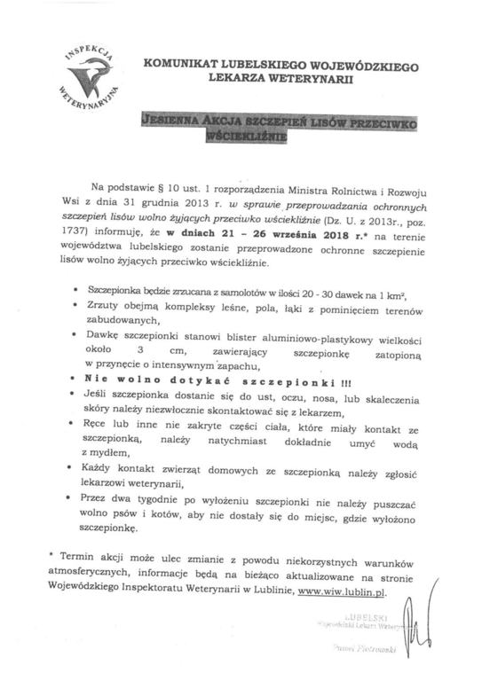 Informujemy, że w dniach 21 - 26 września 2018r. na terenie województwa lubelskiego zostanie przeprowadzone ochronne szczepienie lisów wolno żyjących przeciwko wściekliźnie.