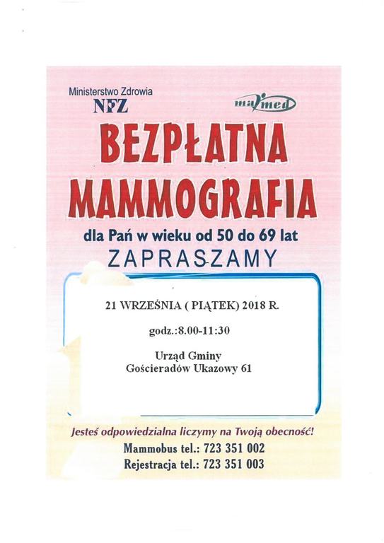 Serdecznie zapraszamy 21 września br. (piątek) od godz. 8.00 do godz. 11.30 na bezpłatną mammografie. Badania będą wykonywane w mammobusie na parkingu przy Urzędzie Gminy Gościeradów.