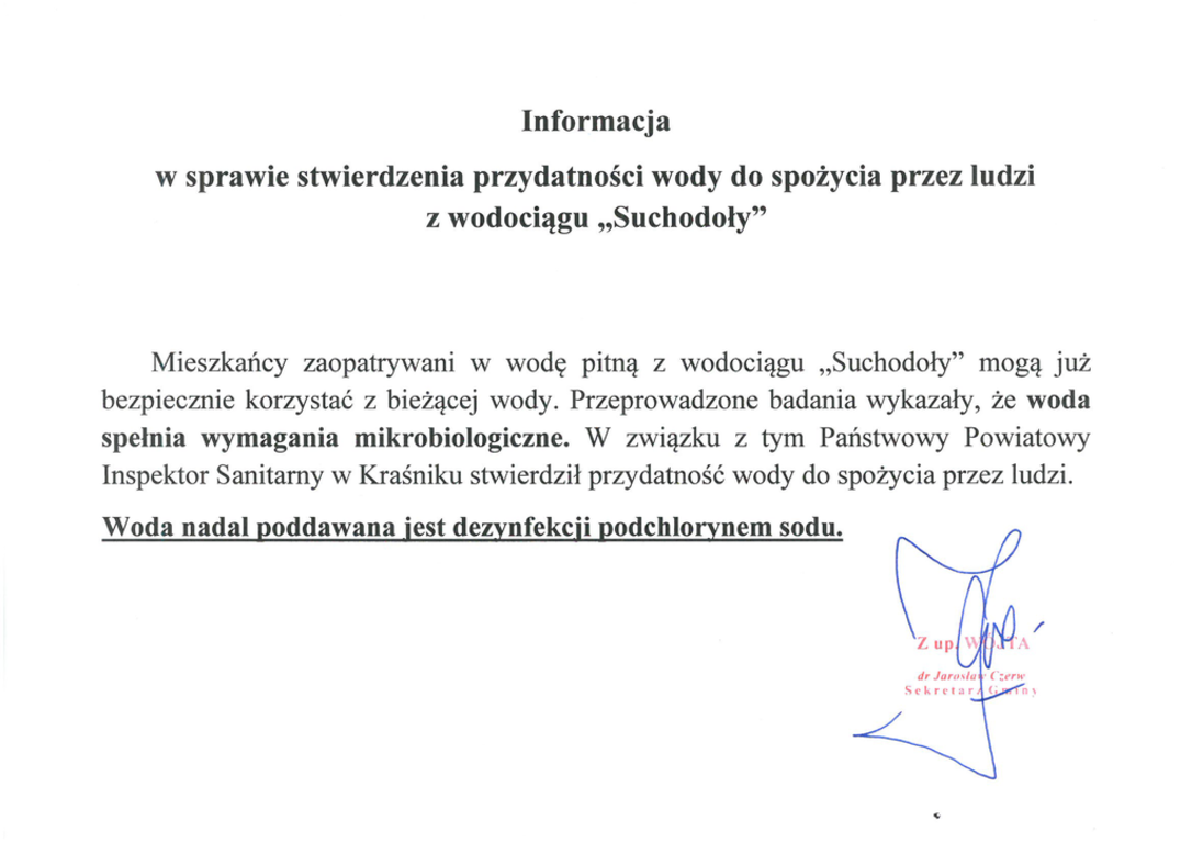 Mieszkańcy zaopatrywani w wodę pitną z wodociągu „Suchodoły” mogą już bezpiecznie korzystać z bieżącej wody. Przeprowadzone badania wykazały, że woda spełnia wymagania mikrobiologiczne. W związku z tymPaństwowy Powiatowy Inspektor Sanitarny w Kraśniku stwierdził przydatność wody do spożycia przez ludzi.