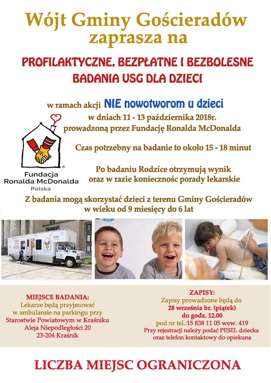 Wójt Gminy Gościeradów zaprasza na PROFILAKTYCZNE, BEZPŁATNE i BEZBOLESNE BADANIA USG DLA DZIECI w ramach akcji NIE nowotworom u dzieci w dniach 11-13 października 2018 roku prowadzoną przez Fundację Ronalda McDonalda. Z badania mogą skorzystać dzieci z terenu Gminy Gościeradów w wieku od 9 miesięcy do 6 la. Lekarze będą przyjmować w ambulansie na parkingu przy Starostwie Powiatowym w Kraśniku.