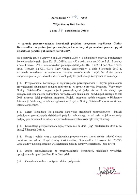 Zarządzenie Nr 279/2018 Wójta Gminy Gościeradów z dnia 29 października 2018 r. w sprawie przeprowadzenia konsultacji projektu programu współpracy Gminy Gościeradów z organizacjami pozarządowymi oraz innymi podmiotami prowadzącymi działalność pożytku publicznego na rok 2019.