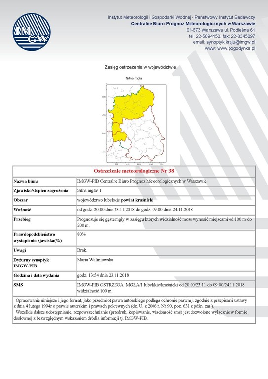 Prognozuje się od godz. 20:00 dnia 23.11.2018 do godz. 09:00 dnia 24.11.2018 gęste mgły w zasięgu których widzialność może wynosić miejscami od 100 m do 200 m.