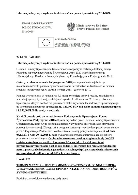 TERMIN 20.12.2018 r. JEST TERMINEM OSTATECZNYM. PO NIM NIE BĘDĄ WYDAWANE SKIEROWANIA UPRAWNIAJĄCE DO ODBIORU PRODUKTÓW ŻYWNOŚCIOWYCH!!!!!!