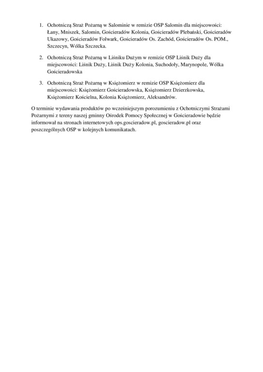 O terminie wydawania produktów po wcześniejszym porozumieniu z Ochotniczymi Strażami Pożarnymi z tereny naszej gminny Ośrodek Pomocy Społecznej w Gościeradowie będzie informował na stronach internetowych ops.goscieradow.pl, goscieradow.pl oraz poszczególnych OSP w kolejnych komunikatach.