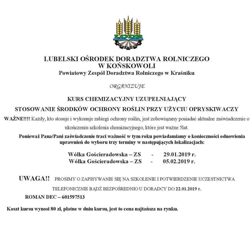 WAŻNE!!!! Każdy, kto stosuje i wykonuje zabiegi ochrony roślin, jest zobowiązany posiadać aktualne zaświadczenie o ukończeniu szkolenia chemizacyjnego, które jest ważne 5lat.