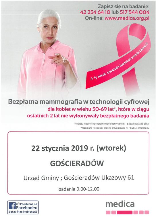 22 stycznia br. (wtorek) zappraszamy od godz. 9.00 na bezpłatne badania mammograficzne.