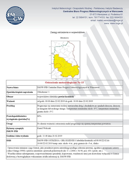 Od godz. 00:00 dnia 22.02.2019 do godz. 10:00 dnia 22.02.2019 prognozuje się zamarzanie mokrej nawierzchni dróg i chodników po opadach deszczu, deszczu ze śniegiem lub mokrego śniegu. Temperatura minimalna około -4°C, temperatura minimalna gruntu około -5°C.