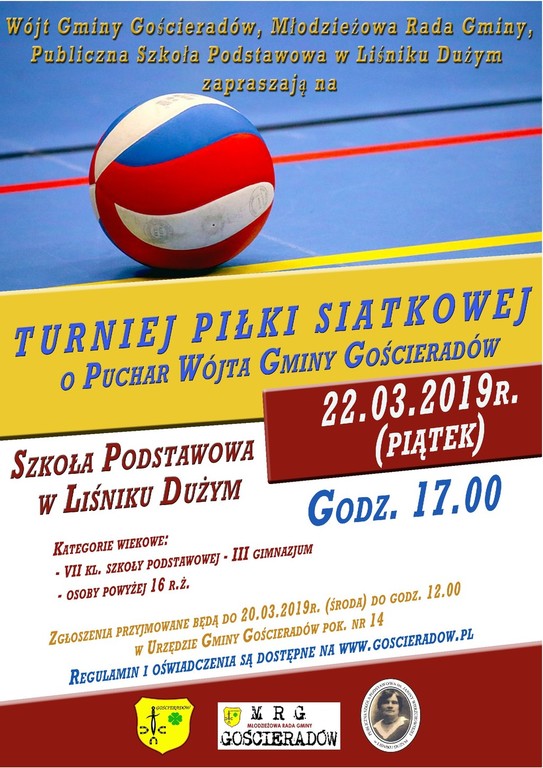 Zapraszamy 22 marca br. (piatek) o godz.17.00 do sali gimnastycznej w Liśniku Dużym na turniej w piłkę siatkową. Drużyny chcące wziąć udział w turnieju proszone są o zgłaszanie swego udziału do 20 marca br. do godz. 12.00 w Urzędzie Gminy Gościeradów pok. 14