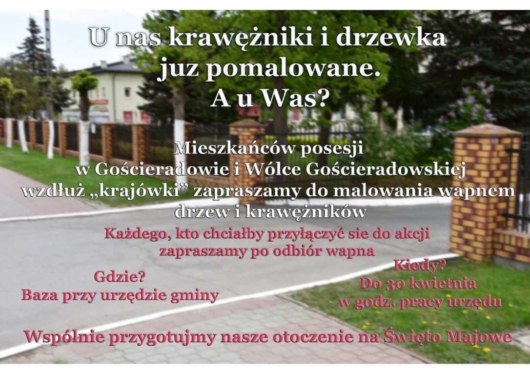 Zapraszamy do malowania drzew i krawężników wapnem. Mieszkańcy posesji wzdłuż "krajówki" mogą zgłaszać się po wapno na baże przy Urzędzie Gminy Gościeradów do 30 kwietnia.