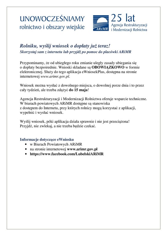 o dopłaty bezpośrednie. Wnioski składane są OBOWIĄZKOWO w formie elektronicznej. Służy do tego aplikacja eWniosekPlus, dostępna na stronie internetowej www.arimr.gov.pl.