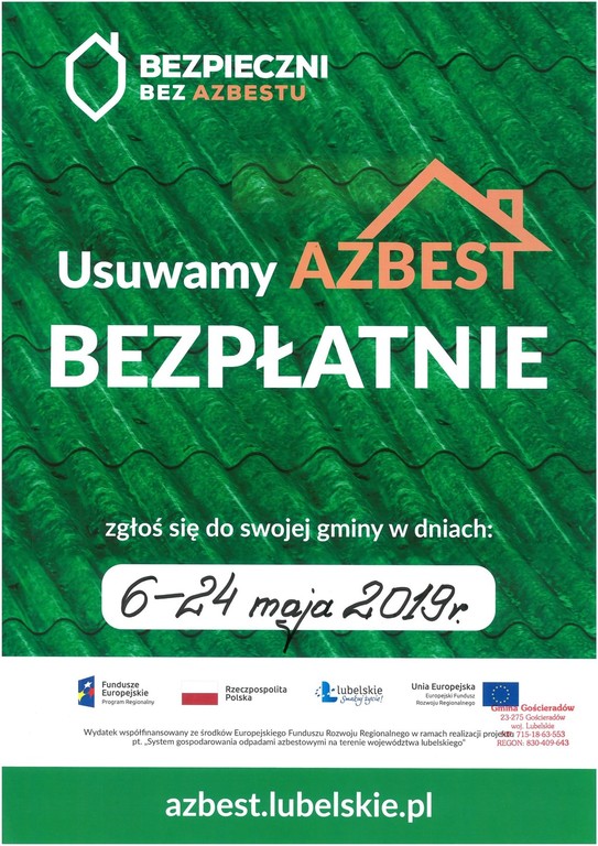 Należy zgłosić się do Urzędu Gminy w Gościeradowie do pok. nr 1 w celu złożenia wniosku o bezpłatne usunięcie azbestu. Wnioski będą przyjmowane w dniach 6 - 24 maja br.