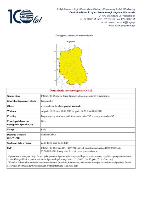 Prognozuje się od godz. 00:00 dnia 08.05.2019 do godz. 07:30 dnia 08.05.2019 lokalny spadek temperatury do -1°C, a przy gruncie do -4°C.