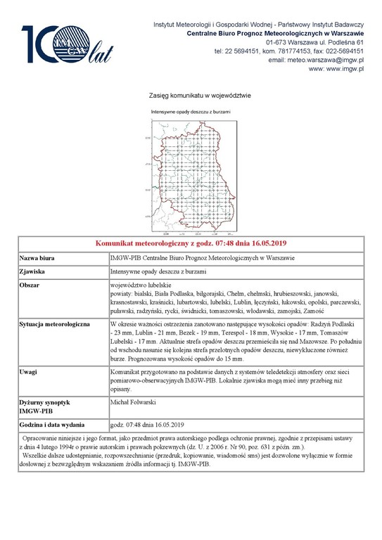 W okresie ważności ostrzeżenia zanotowano następujące wysokości opadów: Radzyń Podlaski - 23 mm, Lublin - 21 mm, Bezek - 19 mm, Terespol - 18 mm, Wysokie - 17 mm, Tomaszów Lubelski - 17 mm. Aktualnie strefa opadów deszczu przemieściła się nad Mazowsze. Po południu od wschodu nasunie się kolejna strefa przelotnych opadów deszczu, niewykluczone również