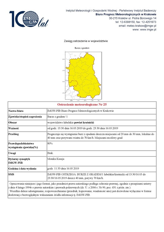Od godz. 13:30 dnia 16.05.2019 do godz. 23:30 dnia 16.05.2019 prognozuje się wystąpienie burz z opadami deszczu miejscami od 20 mm do 30 mm, lokalnie do 40 mm oraz porywami wiatru do 70 km/h. Miejscami możliwy grad.