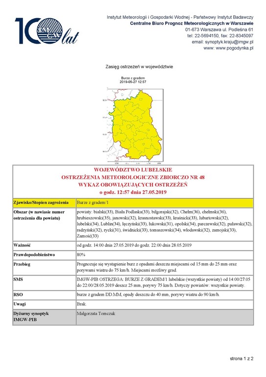 WOJEWÓDZTWO LUBELSKIE OSTRZEŻENIA METEOROLOGICZNE ZBIORCZO NR 48 WYKAZ OBOWIĄZUJĄCYCH OSTRZEŻEŃ