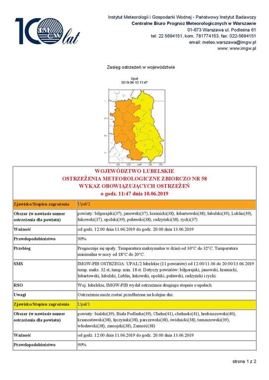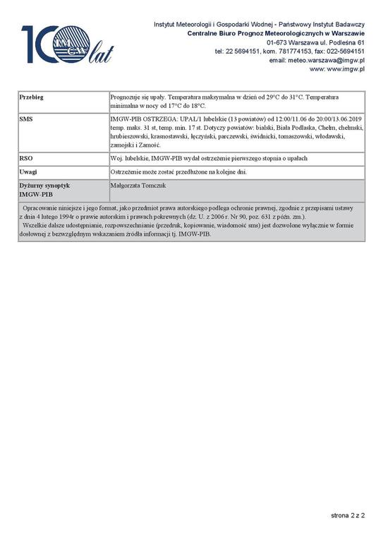 Od godz. 12:00 dnia 11.06.2019 do godz. 20:00 dnia 13.06.2019 prognozuje się upały. Temperatura maksymalna w dzień od 30°C do 32°C. Temperatura minimalna w nocy od 18°C do 20°C.