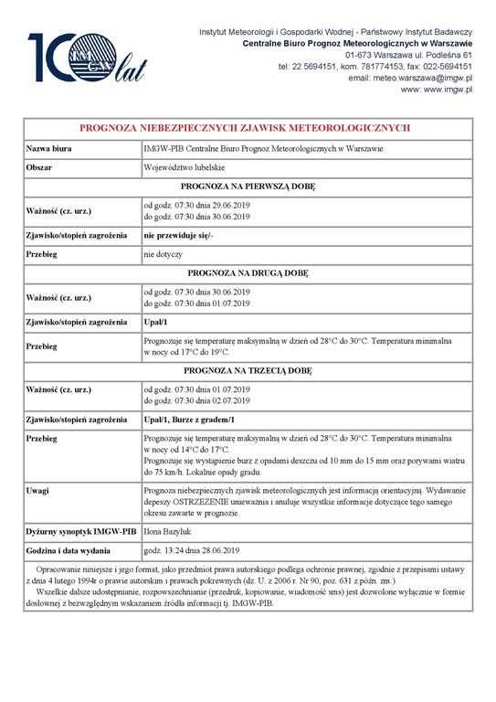 Prognoza niebezpiecznych zjawisk meteorologicznych jest informacją orientacyjną. Wydawanie depeszy OSTRZEŻENIE unieważnia i anuluje wszystkie informacje dotyczące tego samego okresu zawarte w prognozie.