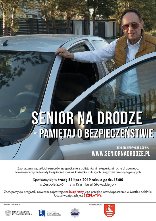 31 lipca o godz. 15.00 w Zespole Szkół nr 3 w Kraśniku odbędzie się bezpłatne spotkanie dotyczące bezpieczeństwa w ruchu drogowym dla seniorów z powiatu kraśnickiego. Tegoroczna edycja organizowana jest pod hasłem: Senior na drodze - pamiętaj o bezpieczeństwie.