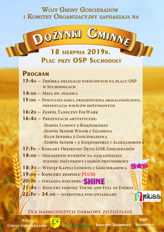 15:oo – Powitanie gości, przemówienia okolicznościowe, prezentacja wieńców dożynkowych