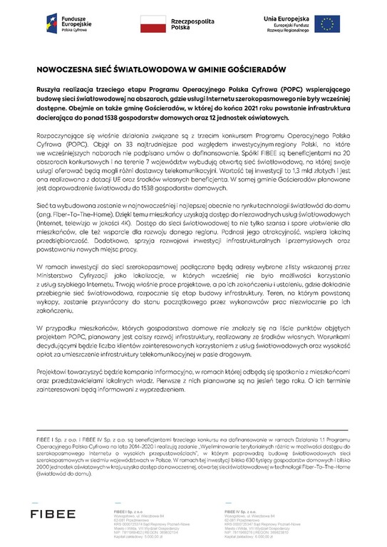 Rozpoczęte działania związane są z trzecim konkursem Programu Operacyjnego Polska Cyfrowa (POPC). Objął on 33 najtrudniejsze pod względem inwestycyjnym regiony Polski, na które we wcześniejszych naborach nie podpisano umów o dofinansowanie. Spółki FIBEE są beneficjentami na 20 obszarach konkursowych i na terenie 7 województw wybudują otwartą sieć światłowodową, na której swoje usługi oferować będą mogli różni dostawcy telekomunikacyjni. Wartość tej inwestycji to 1,3 mld złotych i jest ona realizowana z dotacji UE oraz środków własnych beneficjenta. W samej gminie Gościeradów planowane jest doprowadzenie światłowodu do 1538 gospodarstw domowych.