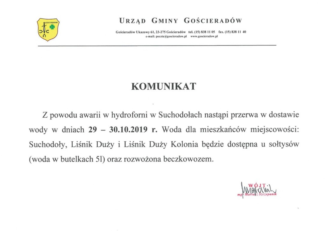Z powodu awarii hydroforni w Suchodołach nastąpi przerwa w dostawie wody w dniach 29 - 30 października 2019r. Woda dla mieszkańców miejscowości: Suchodoły, Liśnik Duży i Liśnik Duży Kolonia będzie dostępna u sołtysów (woda w butelkach 5 l) oraz będzie rozwożona beczkowozem.