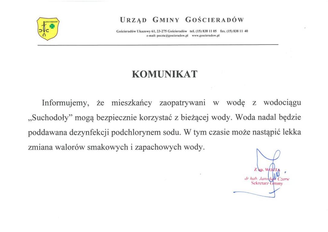 Informujemy, że mieszkańcy zaopatrywani w wodę z wodociągu "Suchodoły" mogą bezpiecznie korzystać z bieżącej wody. Woda nadal będzie poddawana dezynfekcji podchlorynem sodu. W tym czasie może nastąpić lekka zmiana walorów smakowych i zapachowych wody.