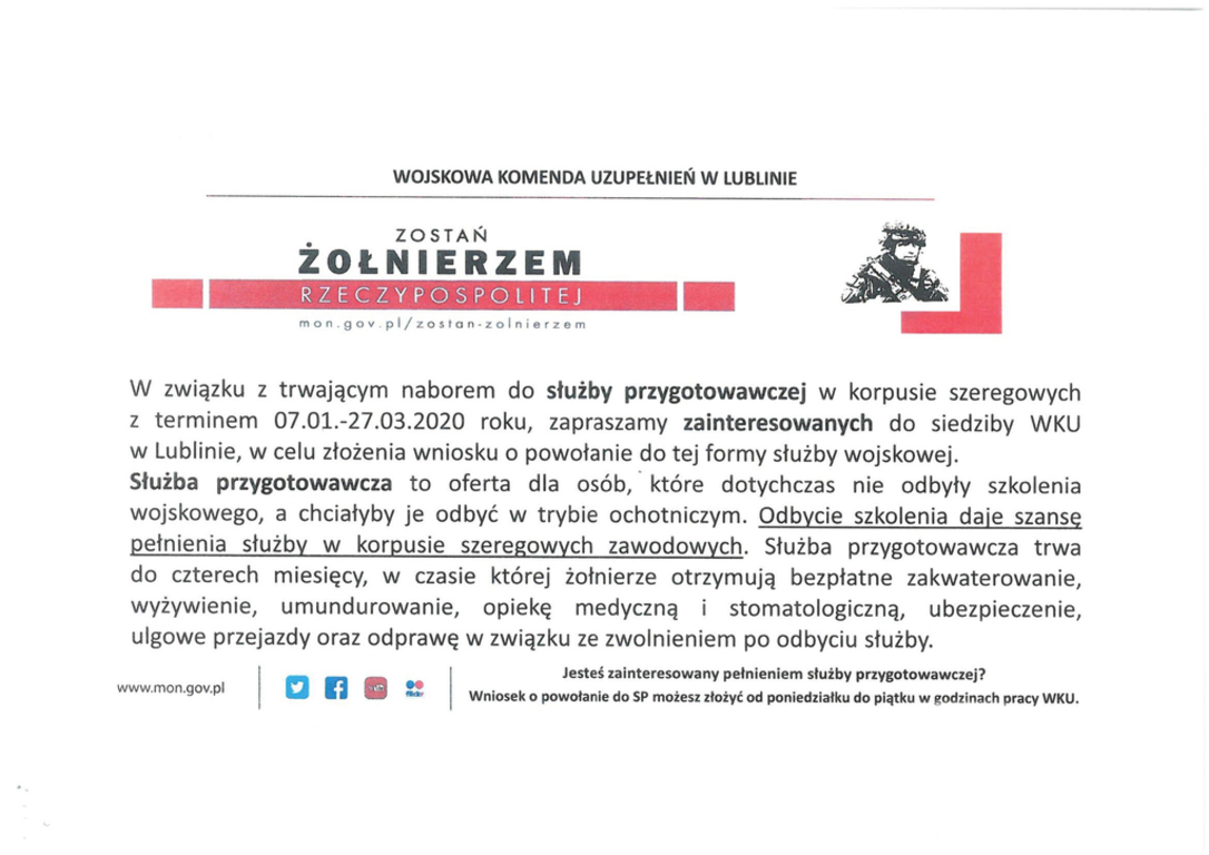 W związku z trwającym naborem do służby przygotowawczej w korpusie szeregowych z terminem 07.01.-27.03.2020 roku, zapraszamy zainteresowanych do siedziby WKU w Lublinie, w celu złożenia wniosku o powołanie do tej formy służby wojskowej.