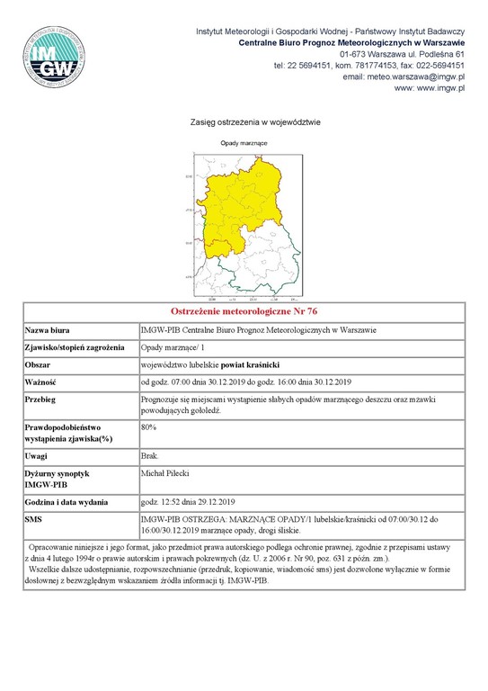 Od godz. 07:00 dnia 30.12.2019 do godz. 16:00 dnia 30.12.2019 prognozuje się miejscami wystąpienie słabych opadów marznącego deszczu oraz mżawki powodujących gołoledź.