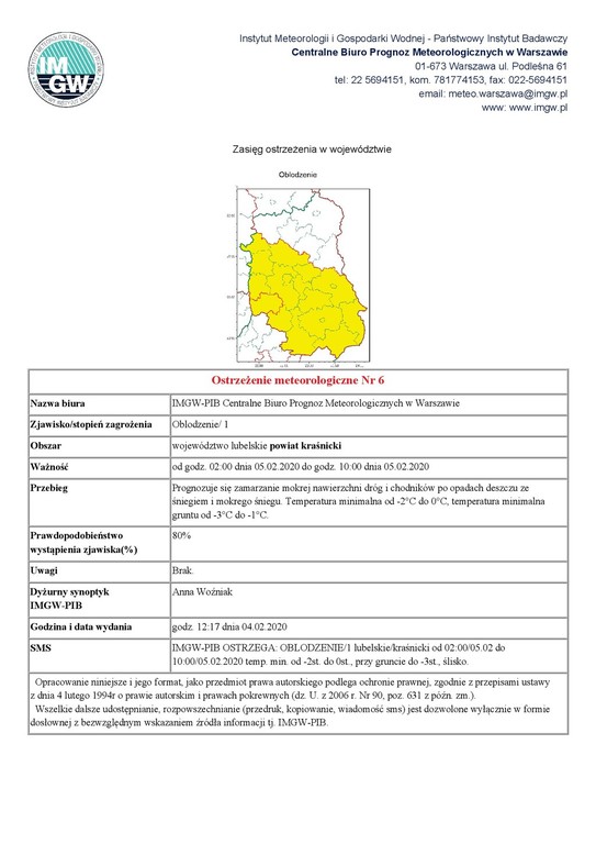 Od godz. 02:00 dnia 05.02.2020 do godz. 10:00 dnia 05.02.2020 prognozuje się zamarzanie mokrej nawierzchni dróg i chodników po opadach deszczu ze śniegiem i mokrego śniegu. Temperatura minimalna od -2°C do 0°C, temperatura minimalna gruntu od -3°C do -1°C.