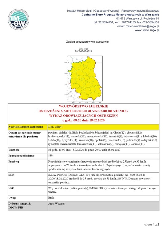WOJEWÓDZTWO LUBELSKIE OSTRZEŻENIA METEOROLOGICZNE ZBIORCZO NR 17 WYKAZ OBOWIĄZUJĄCYCH OSTRZEŻEŃ o godz. 08:20 dnia 18.02.2020