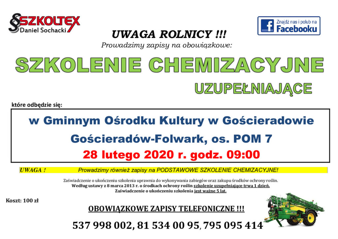 Obowią zkowe szkolenie ze stosowania środków ochrony roślin dla mieszkańców gminy Gościeradów. Szkolenie odbędzie się 28.02.2020 o godz. 9:00 w Gminnym Ośrodku Kultury w Gościeradowie.