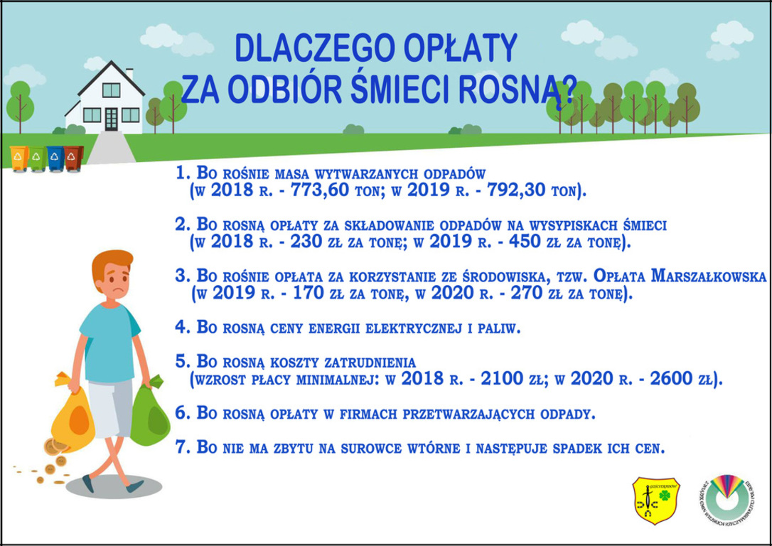 Jest wiele czynników powodujących wzrost opłat za odbiór i zagospodarowanie odpadów komunalnych wytwarzanych w gospodarstwie domowym. Najważniejsze z nich to wprowadzone nowe przepisy prawa i nowelizacja już istniejących. Normy prawne ustanowione ustawami wprowadzają nowe przepisy, na które ani gmina, ani Rada Gminy czy Wójt nie mają żadnego wpływu. Podwyżki cen paliw powodują wzrost kosztów transportu. Podwyżki cen energii elektrycznej, wzrost opłat za korzystanie ze środowiska, w tym tzw. „opłaty marszałkowskiej”, a także większe koszty zatrudnienia z powodu podwyższenia płacy minimalnej powodują większe koszty ponoszone w związku z odbiorem i zagospodarowaniem odpadów komunalnych. Podwyższenie opłat za śmiecie spowodowane jest również tym, że tych odpadów wytwarzamy z roku na rok coraz więcej. Należy pamiętać, że system gospodarowania odpadami komunalnymi jest tzw. systemem zamkniętym, samofinansującym się czyli to co wpłacą mieszkańcy musi pokryć koszty obsługi całego systemu. Oznacza to, że dochody i wydatki powinny się bilansować.
