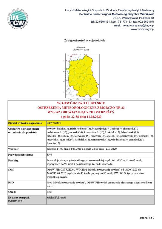 WOJEWÓDZTWO LUBELSKIE OSTRZEŻENIA METEOROLOGICZNE ZBIORCZO NR 23 WYKAZ OBOWIĄZUJĄCYCH OSTRZEŻEŃ o godz. 22:58 dnia 11.03.2020